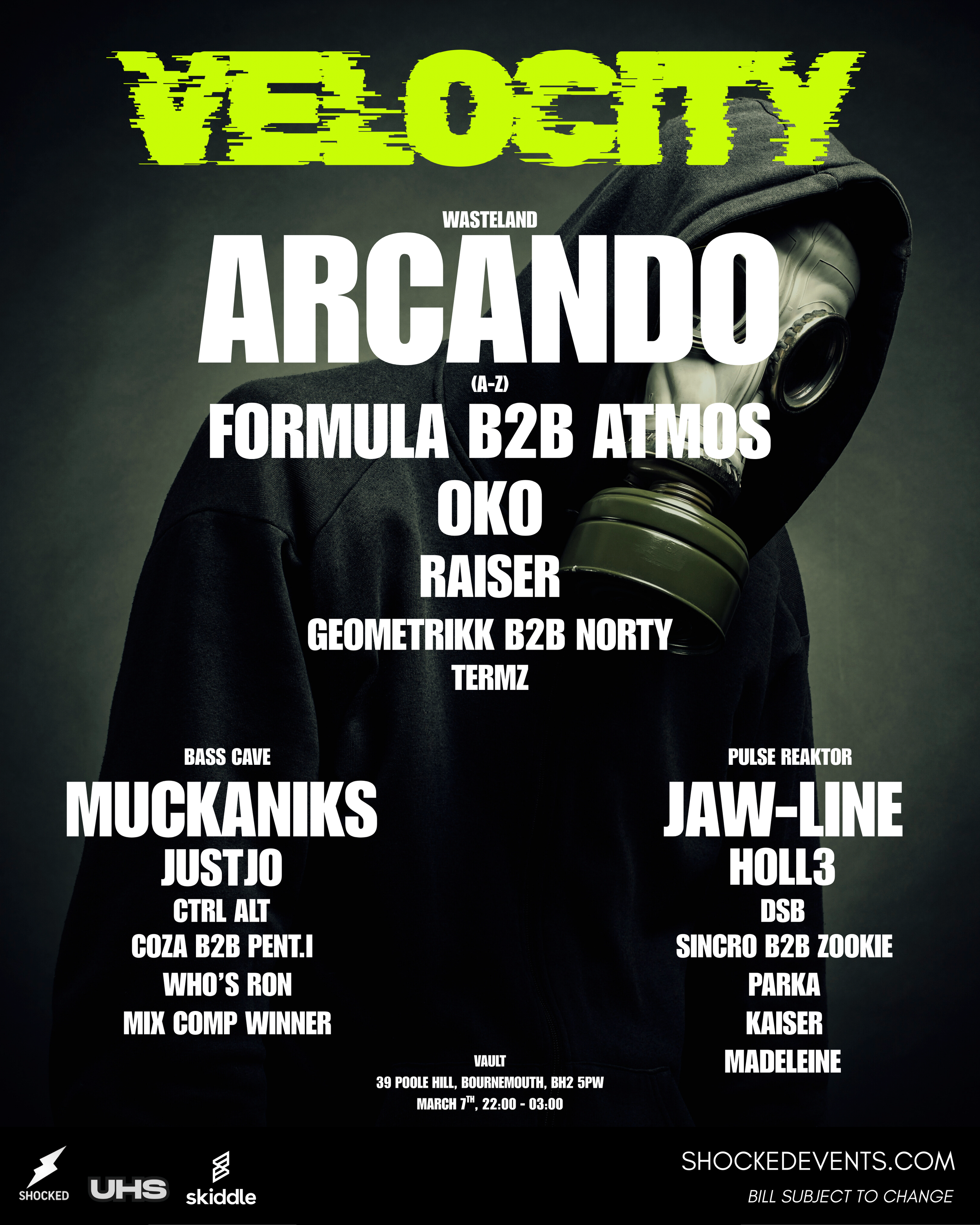 VELOCITY is a drum & bass event series Set against a nuclear-apocalyptic backdrop, VELOCITY drops ravers into a world after the blast: sirens echo and reactors hum like unstable cores pushed past the redline.